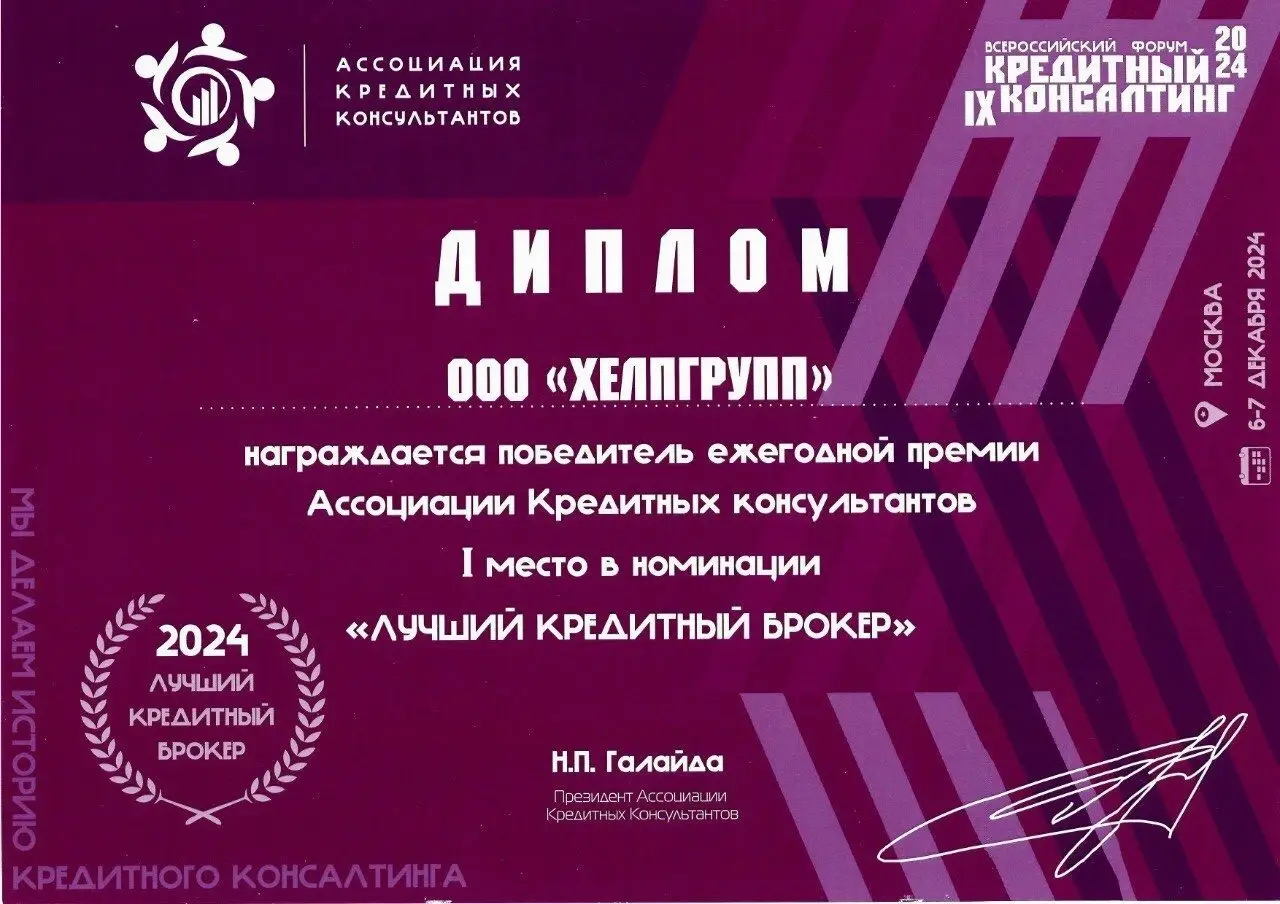 6 декабря на IX Всероссийском форуме «Кредитный консалтинг — 2024» мы завоевали первое место в номинации «Лучший кредитный брокер 2024».
